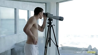 Freak peeps on his stunning neighbor and strokes his long shaft